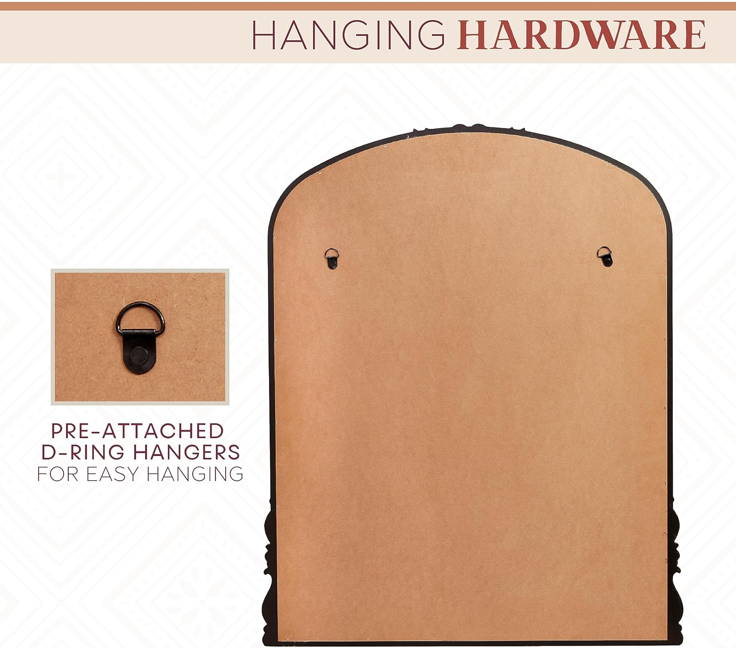 - EASY TO HANG: This mirror includes pre-attached d-ring hangers for vertical wall hanging.