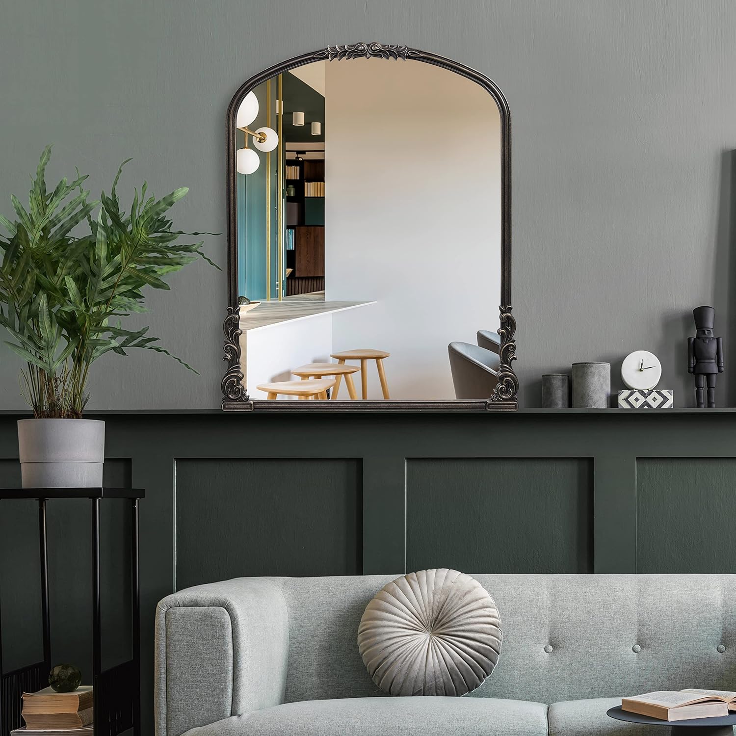 English Estate Carved Arch Wood Wall Mirror, Mirror for Entryway, Living Room, Bathroom, Antique Black, 28.4x35