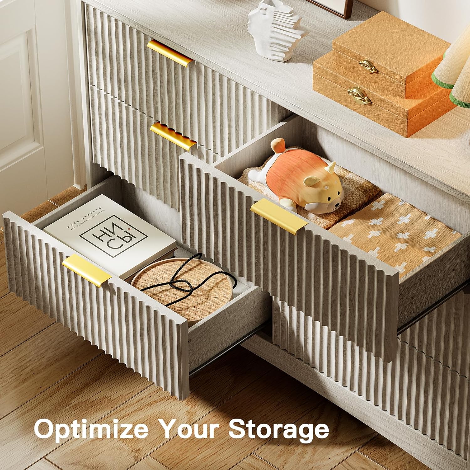 - 【Large Storage Capacity】The fluted dresser is equipped with 6 spacious drawers, capable of accommodating over 80 garments, 30 toys, 60 tissues, 80 skirts, 70 hats, and 130 pairs of socks. This generous storage space allows for the organized arrangement of clothing, bedding, cosmetics, or jewelry, thereby assisting you in maintaining a clean and orderly environment.