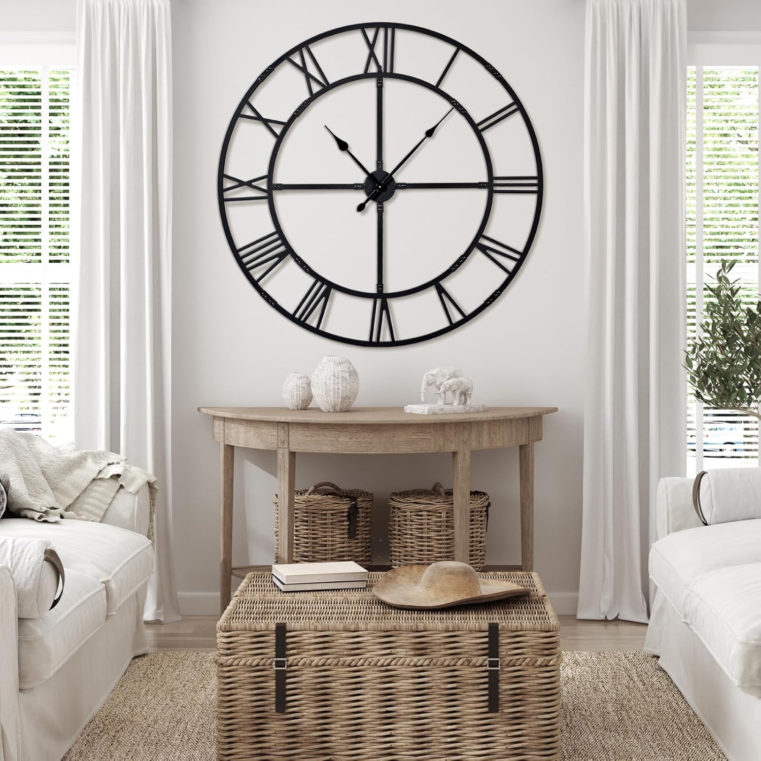 - Oversized Modern Design – This large wall clock features a minimalist open-face design with Roman numerals and black metal craftsmanship, making it a stunning decorative wall clock for living room, entryway, or office.