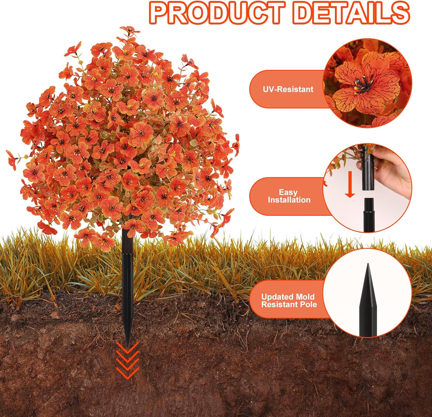 - ๐ใAll-Weather Durabilityใ The 6.1-inch extra-long ground stakes securely anchor these 4pcs all-in-one fall floral bushes deep into soil, keeping them standing strong through heavy winds and storms. These durable artificial autumn shrubs are built to withstand any outdoor environment, season after season.